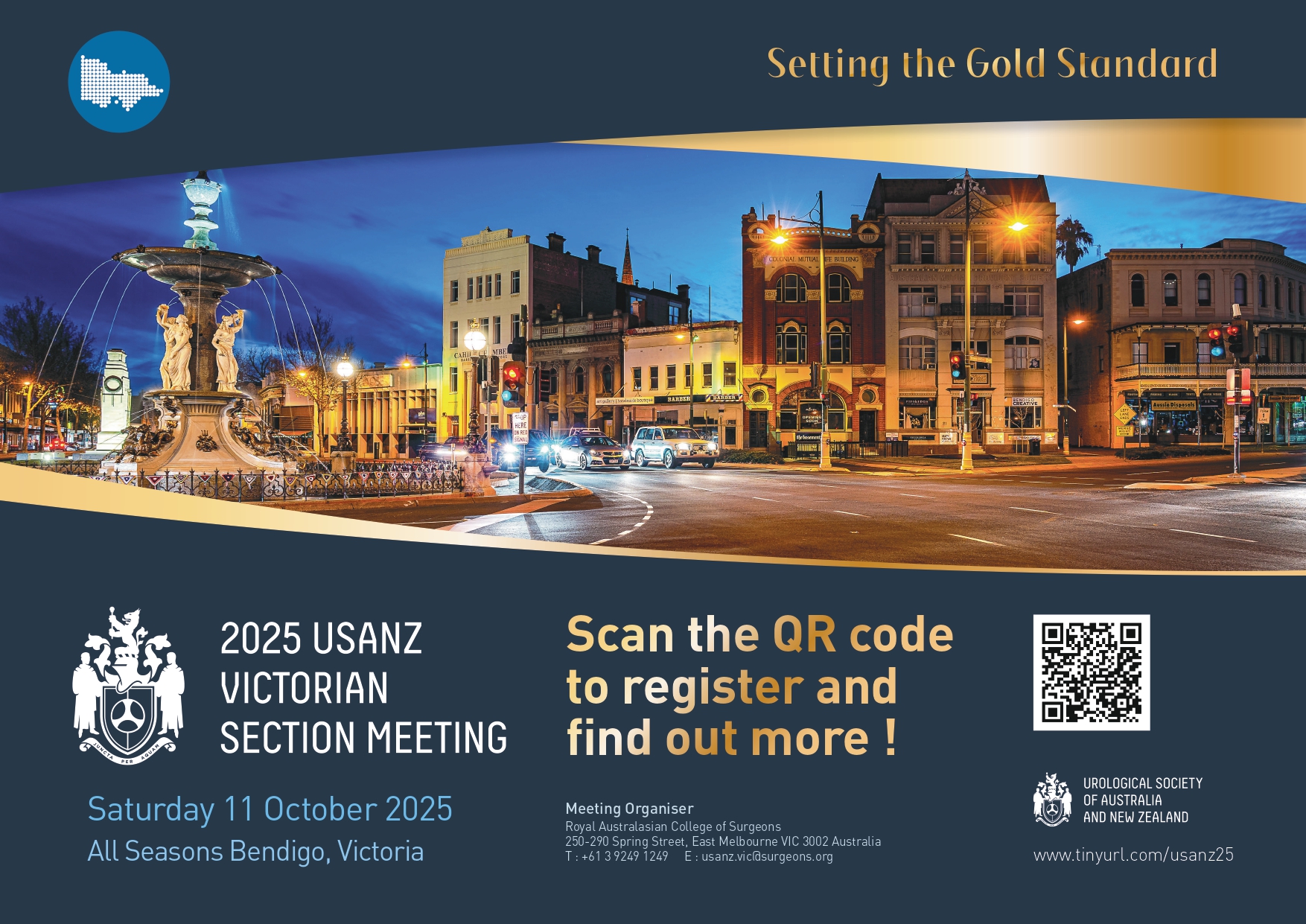 This year’s meeting theme, “Setting the Gold Standard”, draws inspiration from Bendigo’s rich heritage and reflecting on our commitment to excellence in urology. Join us on Saturday 11 October 2025 at the All Seasons Bendigo for a vibrant program designed for urology professionals.